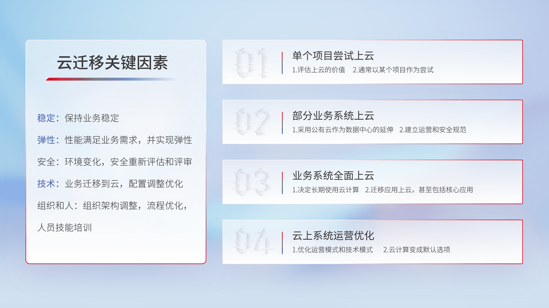 结合实际业务,,从规划设计、、、、云平台选型、、云原生改造、、、、数据迁移、、集成交付,,,迁移全过程为客户识别最佳上云路径,,,,做好风险识别管理,,,,设计网络架构、、、身份权限、、、、安全审计合规、、、、操作审计、、、日志审计、、、监控告警策略、、、、多站点容灾设计等,,,,对云上基础设施进行整体规划,,,提升IT治理水平,,,以满足弹性、、高可用、、高性能的需求。。