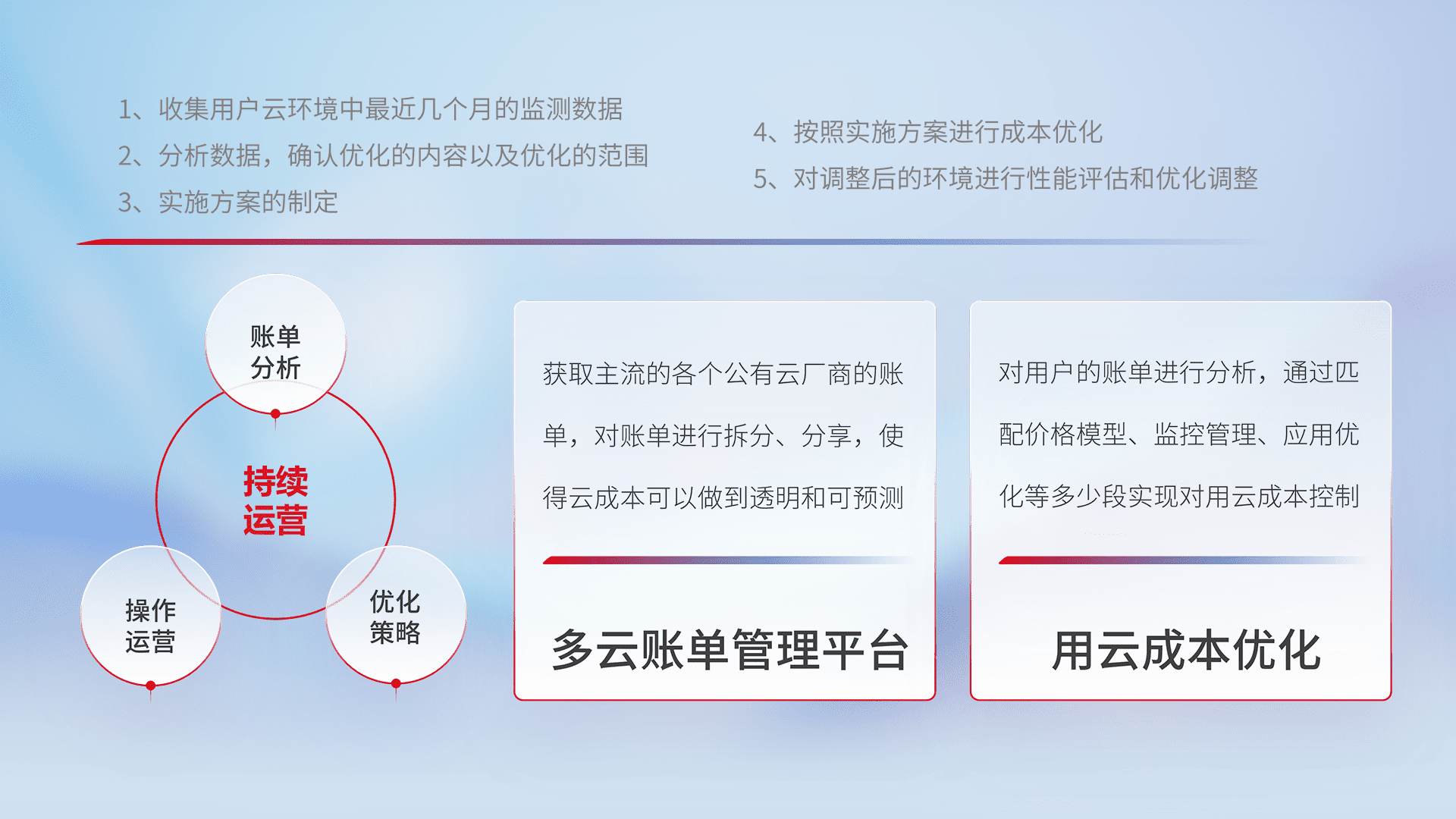 通过多云纳管,,,,以统一的资源数据模型把客户的云资源进行抽象和封装,,,进而实现对多云资源的统一操作,,,,保障云资源管理的可靠性、、、、稳定性与可用性。。量身定制化运维内容,,,配置、、、、开发运维、、、、补丁管理、、、备份、、监控、、、认证和访问管理、、、审计和日常巡检等,,,保障在用云过程中的可靠度,,稳定度以及高可用率。。。。